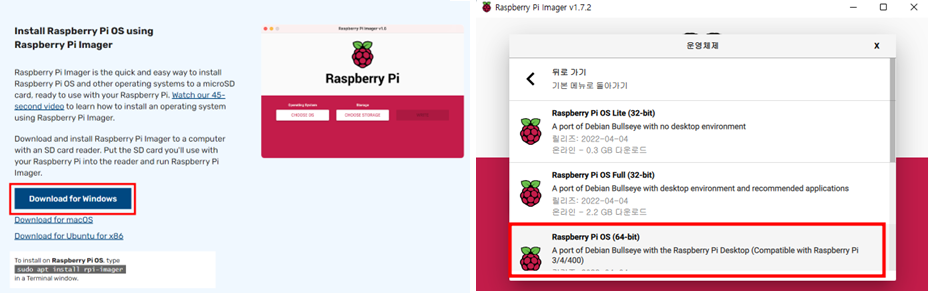 - 레즈베리파이4 이상은 64bit 설치 권장