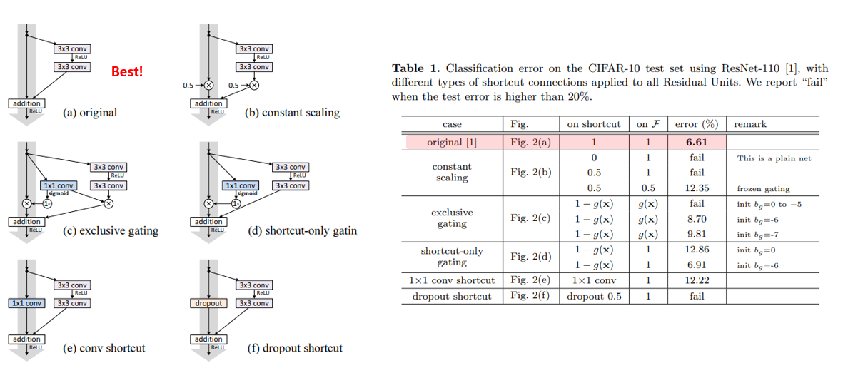 우선 기존 ResNet에서 사용되던 Identity shortcut을 5가지 다양한 shortcut으로 대체하는 방버과, 각각을 적용하였을 때의 실험 결과를 확인할 수 있는데, 실험결과 아무것도 하지 않았을때(Identity shortcut 상태) 가장 성능이 좋은 것을 확인할 수 있음. 이에 대한 discussion으로, 제안하는 gating 기법과 1x1 conv 등을 추가하면 표현력(representational ability)은 증가하지만 학습 난이도를 높여서 최적화하기 어렵게 만다는 것으로 추정된다고 설명하고 있음.