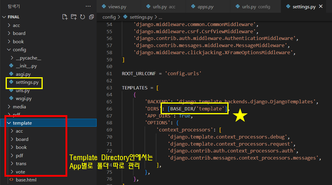 - 따라서 따로 폴더로 관리하는게 훨씬 깔끔하며, 이를 위해 settings.py에 'DIRS'를 수정해줘야 함.