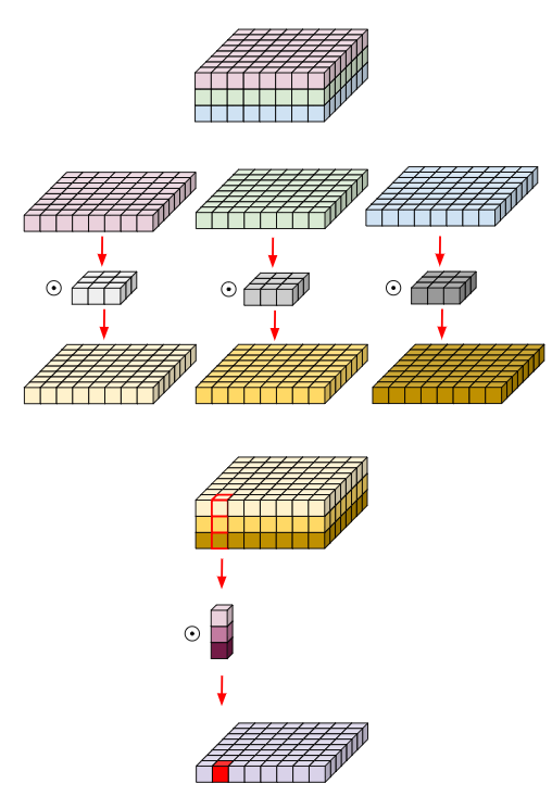 아래 그림처럼 8x8x3 Matrix를 각 채널별로 분리시킨뒤 3x3 커널로 Convolution을 진행한뒤 다시 합치는 구조를 갖음. 즉 채널 방향으로는 Convolution을 하지 않고, 공간방향(Width x Height) 으로만 Convolution을 진행함으로써 연산량을 줄임.